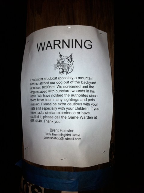A resident on Hummingbird phoned to report that she’d found a dead cat in her yard this morning with its head gone, presumably the result of some predator animal. The cat was yellow, not fully grown.