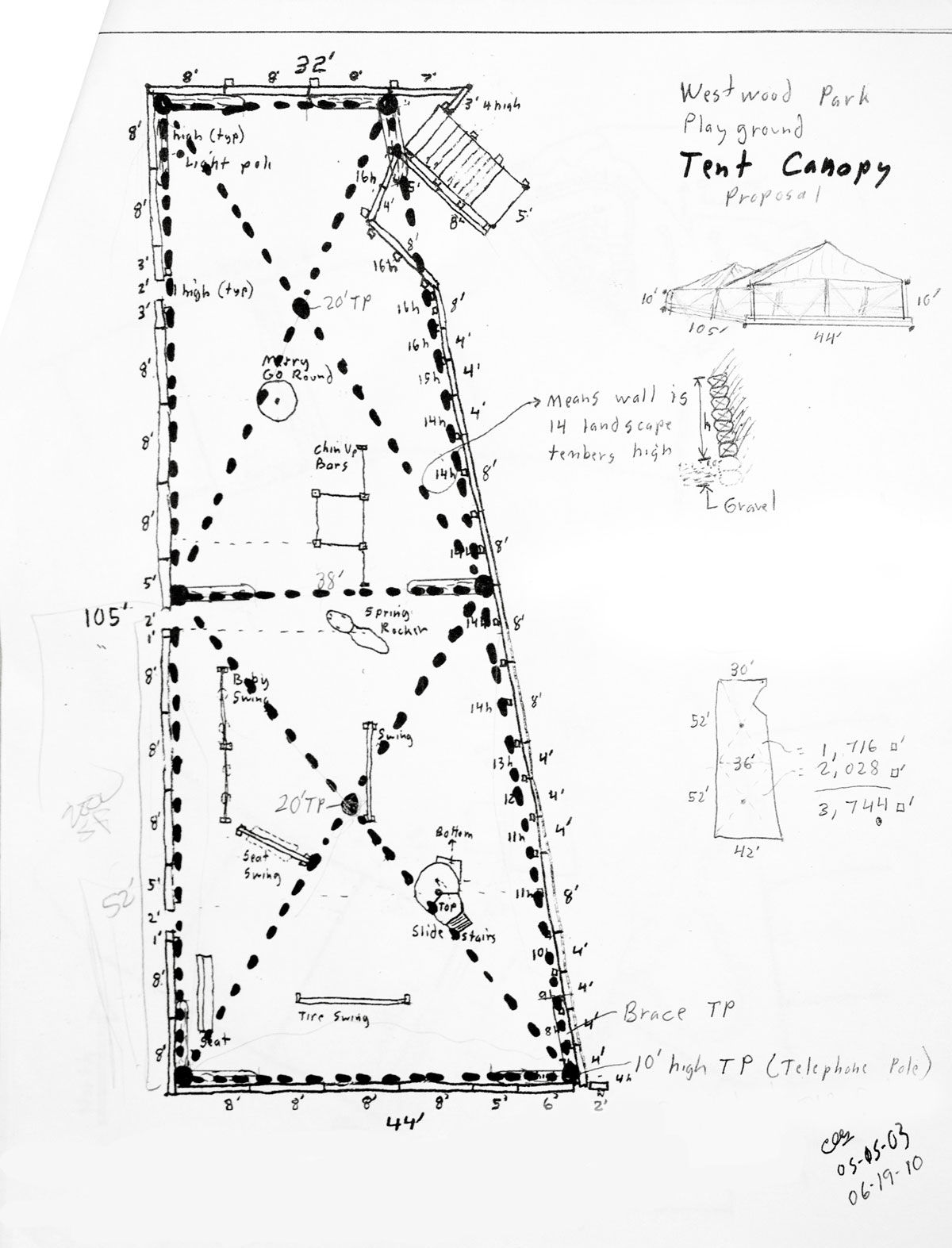Click the second diagram to see some detail of his proposed design. It would consist of six 10′ telephone poles (10′ above ground, buried 4-6′) with two 20′ (above ground) poles acting as the high points.